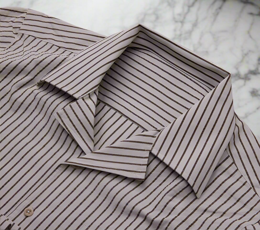 This men's casual shirt features a classic Cuban collar and a refined brown/ blue base accented with subtle stripes, offering a sophisticated yet relaxed look. Made to measure, it ensures a perfect fit tailored to your exact measurements, combining comfort with style. Ideal for smart-casual occasions, this shirt balances timeless design with personalized craftsmanship.