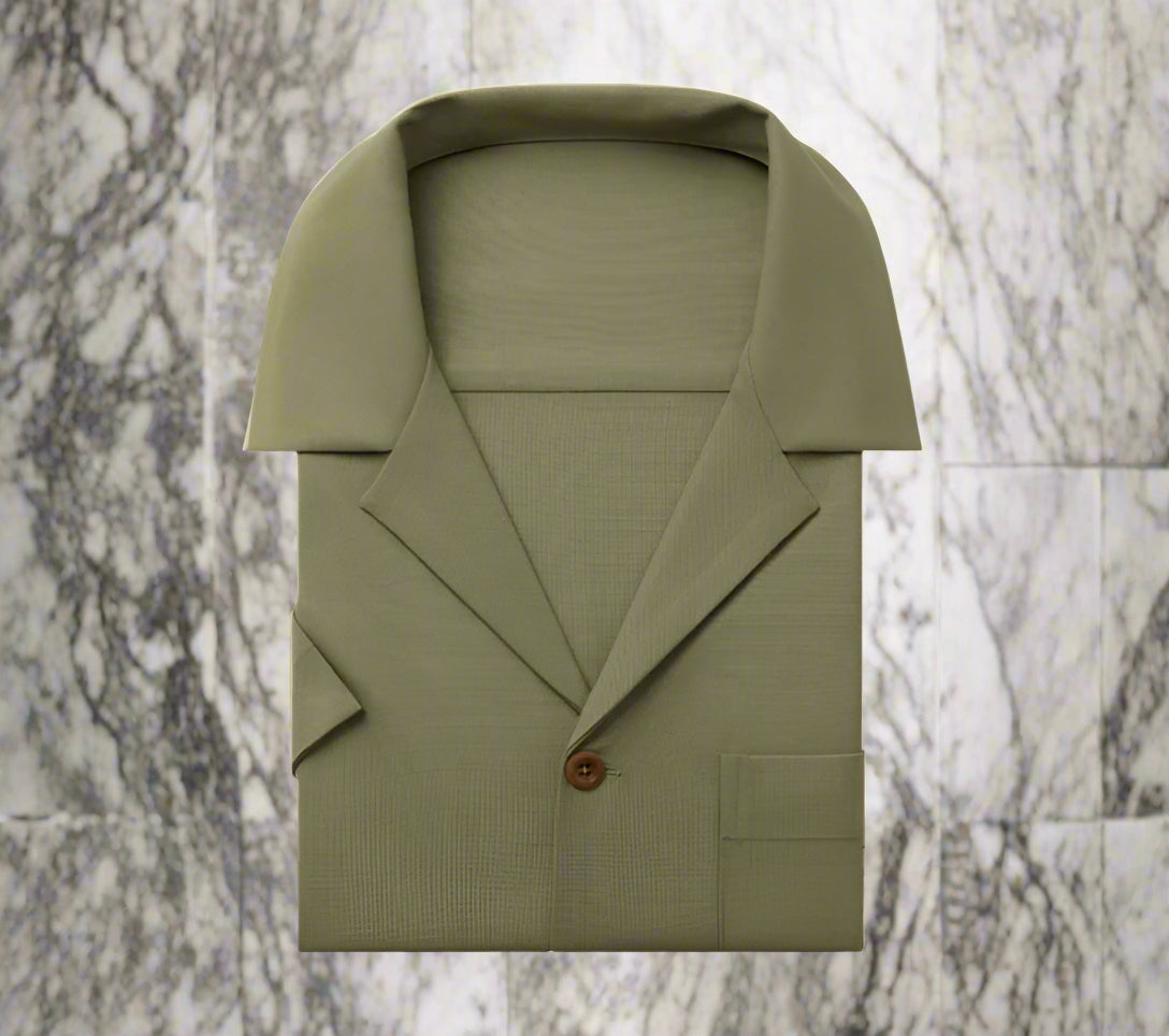 This men's green casual shirt features a classic Cuban collar design, tailored to your exact measurements for a perfect fit. Crafted with attention to detail, it combines comfort and style, making it ideal for relaxed yet refined occasions. The made-to-measure approach ensures a personalized garment that complements your silhouette effortlessly.
