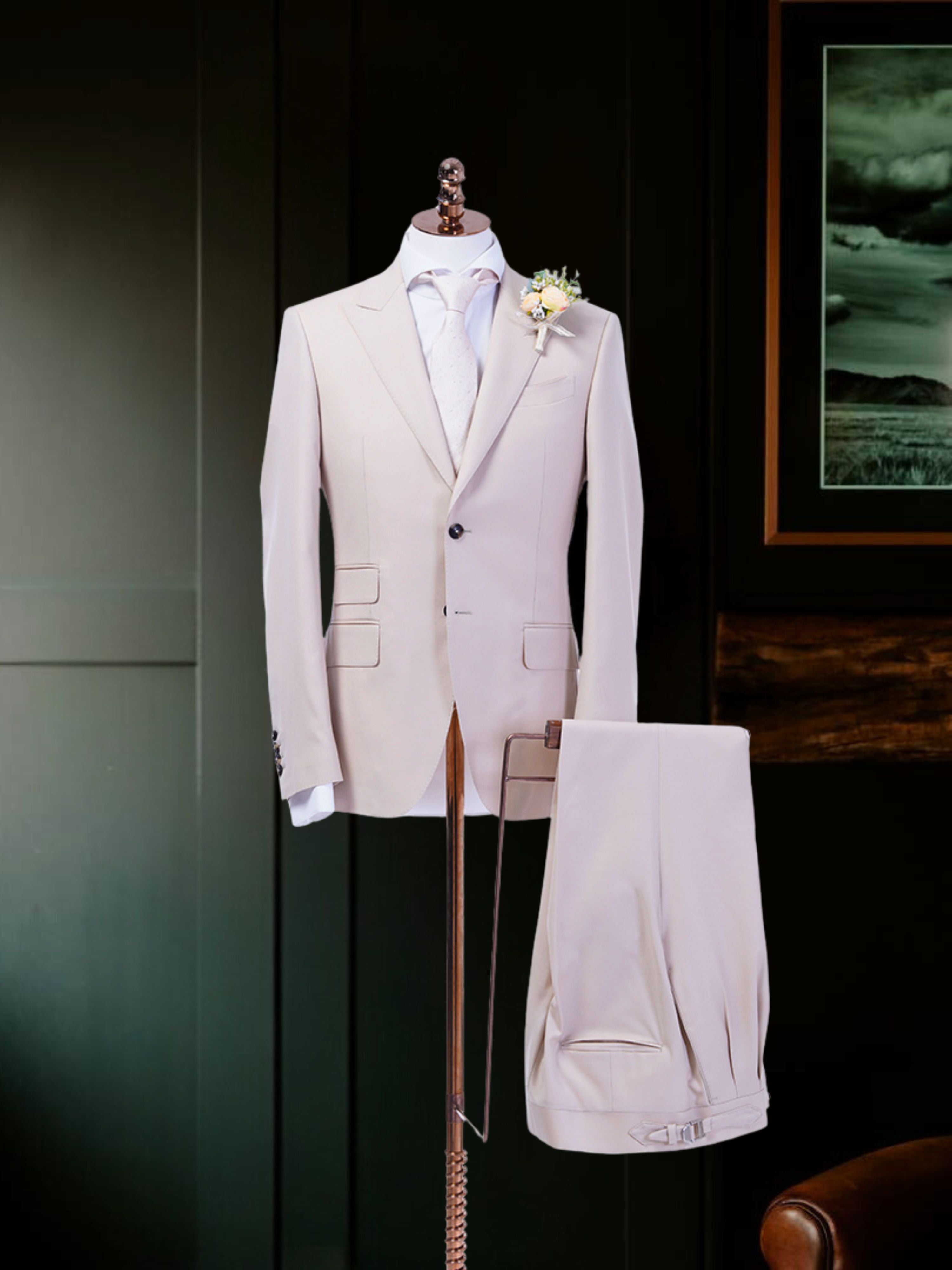 Experience luxury with our Men's Premium Worsted Wool Stone Suit. Made to Measure, each suit features a Peak Lapel, Half Canvas construction, and a Single Breast Two Button design. The trousers features a straight facing shape, with button back pockets, and a D shape bar tack for added style and durability. Handmade Lapel eye adds to the overall sophistication of this suit.
