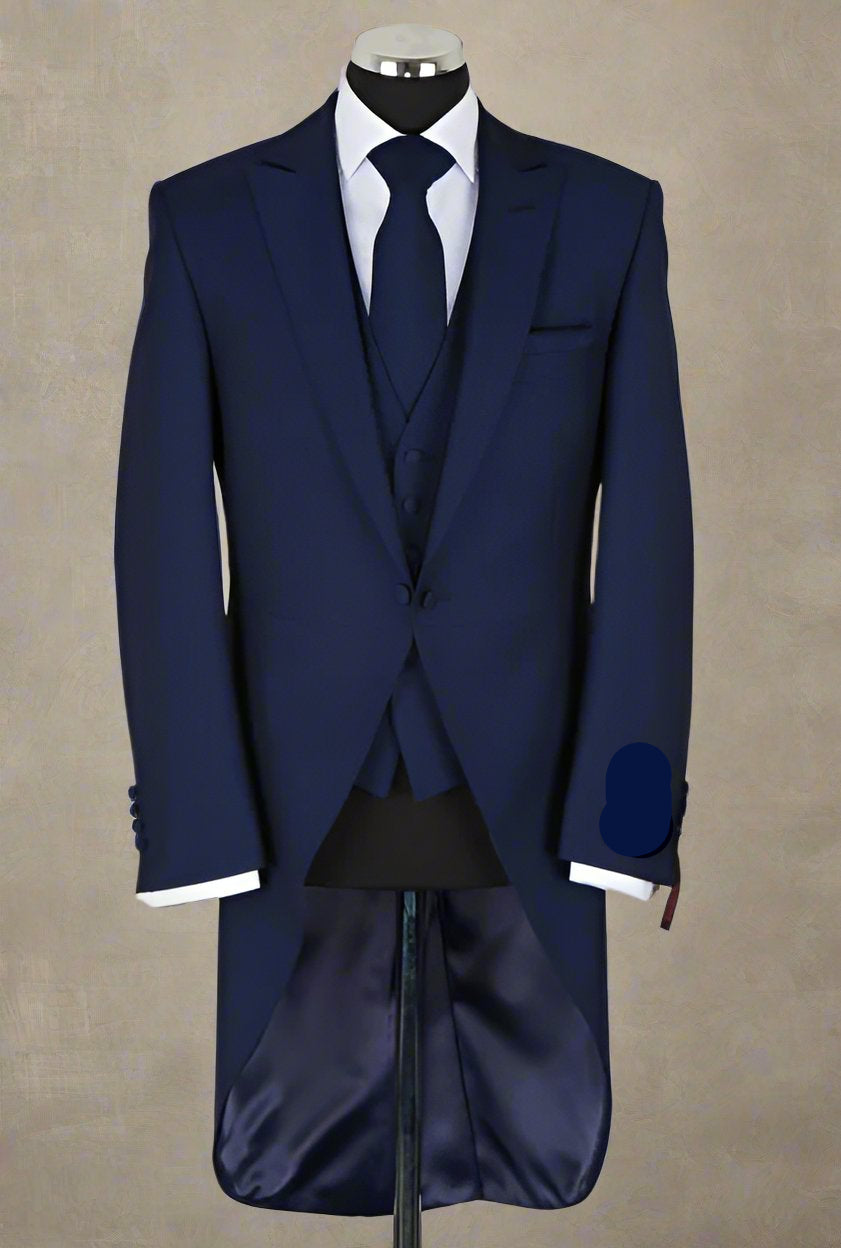 Expertly crafted with luxurious Vitale Barberis Canonico wool and mohair, this French Navy Morning Coat is the epitome of sophistication. Its high-quality construction ensures both a sleek look and durable wear. Perfect for formal occasions, this coat will elevate any outfit with its timeless and elegant design.